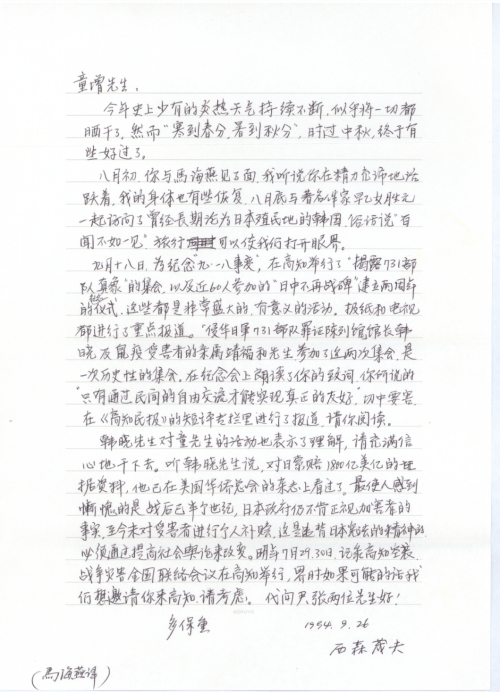九月十八日,为纪念“九•一八”事变,在高知举行了“揭露731部队真[相]”的集会,以及近60人参加的“日中不再战碑”建立两周年的纪念仪式。这些都是非常盛大的、有意义的活动。报纸和电视都进行了重点报道。侵华日军731部队罪证陈列馆馆长韩晓及鼠疫受害者的亲属靖福和先生参加了这两次集会,是一次历史性的集会。在纪念会上朗读了你的致词。你所说的“只有通过民间的自由交流才能实现真正的友好”,切中要害,在《高知民报》的短评专[栏]里进行了报道,请你阅读。