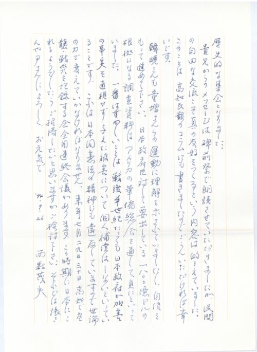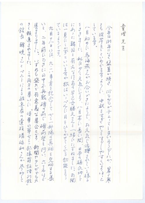 韓暁さんも童増さんらの運動に理解を示されていました。自信をもって進めて下さい。日本政府に対して要求している千八〇〇億ドルの根拠になる調査資料はアメリカの華僑総会を通して見たといっていました。一番はずかしいことは戦後半世紀たっても日本政府が加害の事実を直視せず与えた被害について個人補償はーないといっていることです、示は日本国憲法の精神にも違反していますので世論の力で変えていかなければなりません、来年七月二九日三十日高知で空襲、戦災を記録する会全国連絡会議があります、この時期に日本にこれるようでしたにご招待したいと思いますがご検討下さい、それでは張さんや尹さんによろしく.お元気で