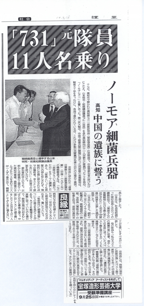 十七日、高知市で聞かれた高知県七三一部隊研究会(栗原透会長)の交流会で、中国側参加者の呼びかけにこたえ、山本明司・前県議会長(七0)(自民)を含む高知県内の十一人が新たに隊員だったことを告白、「ノーモア七三一」を誓い合った。第二次大戦中、中国で細菌兵器の開発に当たった同部隊の実態解明は、戦後五十年をきっかけに、各地で進められているが、これだけ多数の元隊員が名乗り出たのは極めて異例。