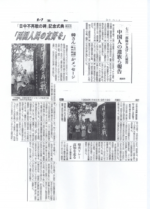 为了纪念“中日不再战斗”纪念碑的修建两周年,在该碑立碑人的主办下,约十八日,在高知市的城西公园的碑前,五十位市民为了不再战和中日的友好参加发誓。