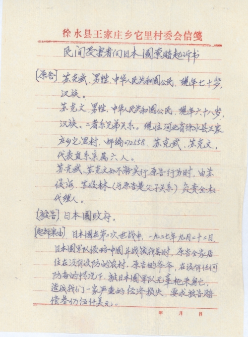 (起诉案由)日本国在第二次世战中,一九三七年九月二十二日,日本国军队侵略中国并[占]领我县时,原告全家居住在没有设防的农村。原告的爷爷,在没有任何防备的情况下,被日本国军队无辜枪杀身亡,造成我们一家严重的经济损失,要求被告赔偿叁万伍仟美元。