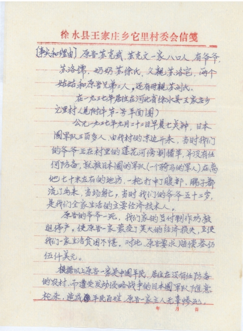 在我十二岁的时候,苏克武、苏克文的爷爷,被日本国军队枪杀身亡。我清楚的记得是民国二十六年阴历八月二十三日。也就是公元一九三七年九月二十二日。当时我在我村的莲花河北边居住,九月二十二日早上七点钟,我刚走出我家的大门口,就看见苏洛儒(克武、克文的爷爷)在莲花河的西边割草,我手里拿着铁镐准备去农田送给我的父亲。刚往西走了不远,就从东边传来一声枪响,我忙回头一看,苏洛儒“啊”的一声惨叫就倒了下去。日本国军队大约有三百多人从大街的东边往南开过去。等他们走后,我赶紧跑到苏洛儒身旁一看,他已气绝身亡。随后赶来的还有苏志浩,这就是当年发生的如[实]情况。