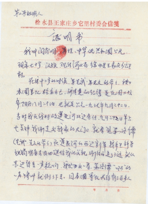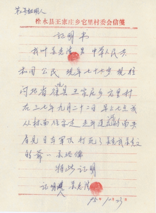 我叫苏志浩(手印),男,中华人民共和国公民,现年七十七岁,现住河北省徐水县王家庄乡它里村。在三七年九月二十二日早上七点,我从村南往家走。走到莲花河的南头,看见日本军队打死了苏克武、苏克文的爷爷苏洛儒。