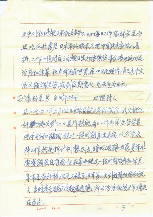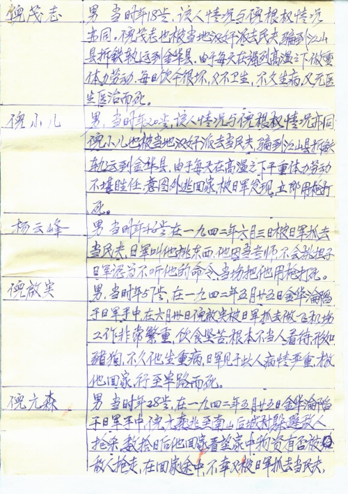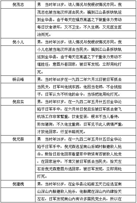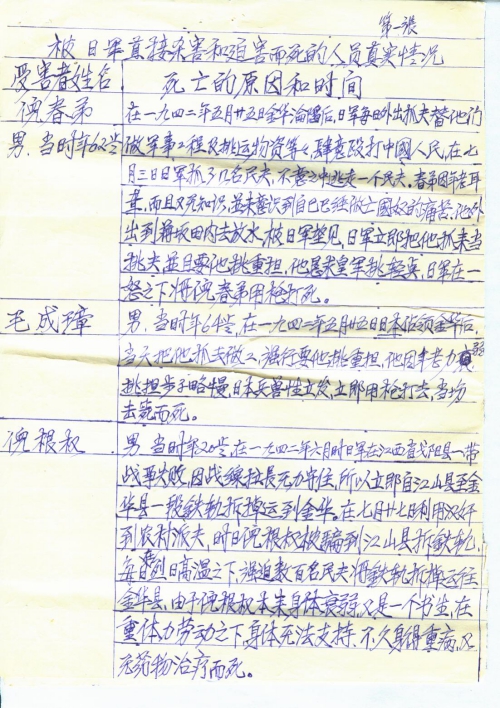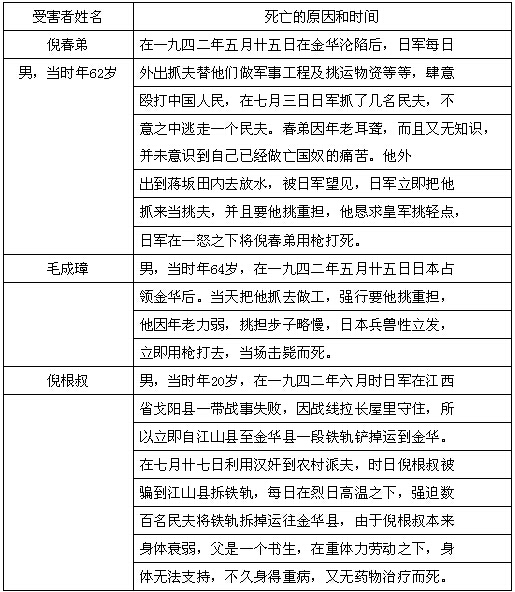 金华县被日军侵占后,在1942年8月初旬我夫[根根]在田中割稻时被日军抓去当苦力[民夫]每日工作极端劳累,而且吃食非常差,日本军队根本不把中国民夫当做人看待,工作一段时间之后被日军打伤跌伤,时候暗地逃回家治疗和休养,但当时无药可买,家中又无经济,自己家中生活又极端坚苦,病到后期恶化,无法医治而亡。