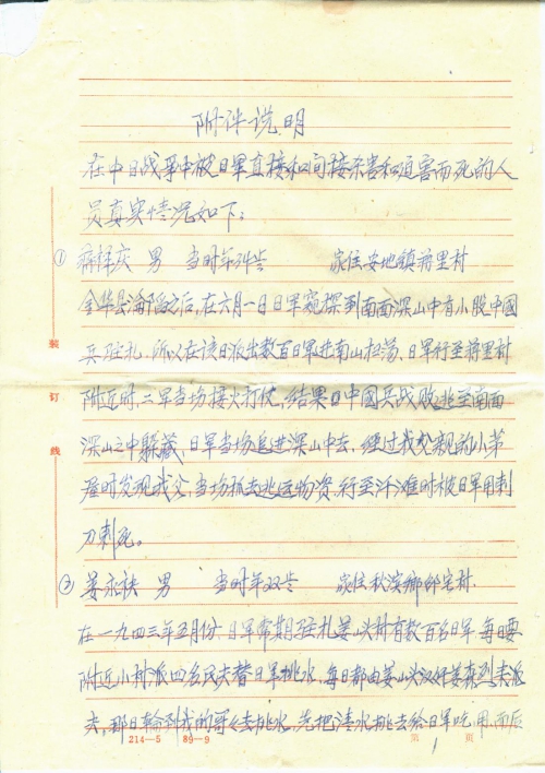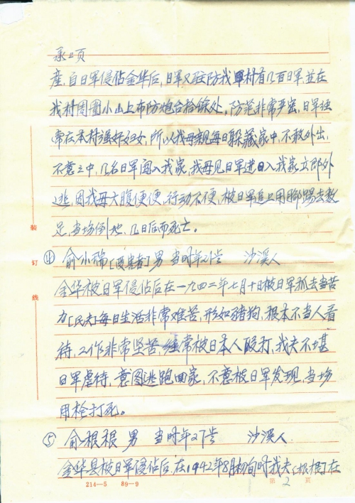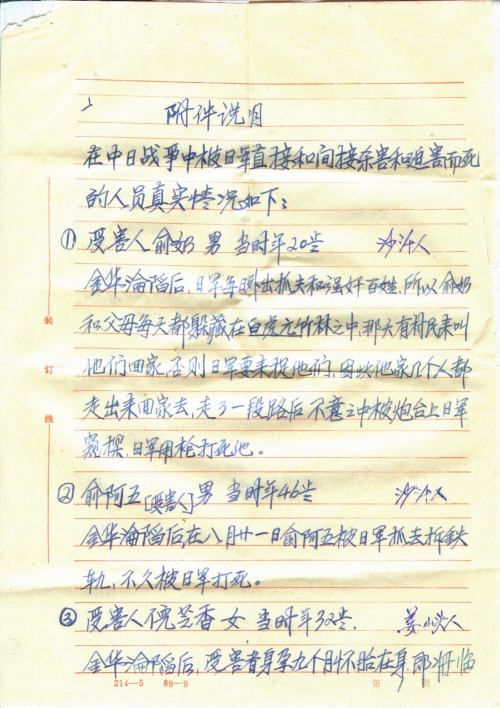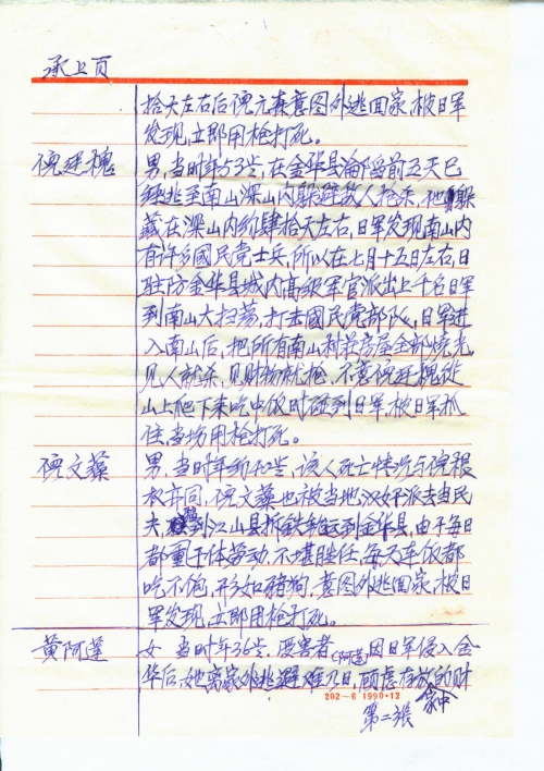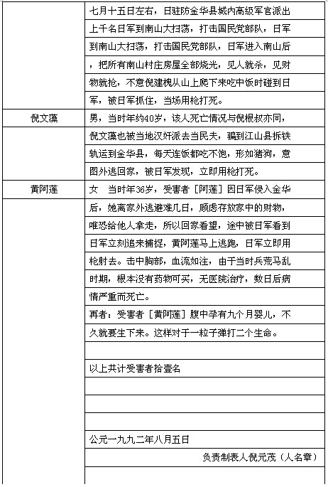 金华后,日军又驻防我村有几百日军,并在我村周围小山上布防炮台拾余处,防范非常严密,日军经常在本村强奸妇女,所以我母亲每日躲藏家中,不敢外出,不意之中,几名日军闯入我家,我母见日军进入我加立即外逃,因我母大腹便便,行动不便,被日军追上用脚踢去数足,当场倒地,几日后而死亡。