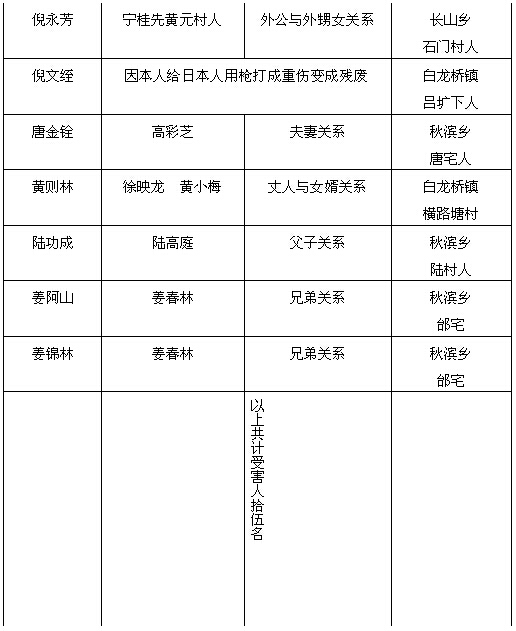 ⑧ 倪先烈 男 当时年66岁 家住白龙桥镇吕圹下人