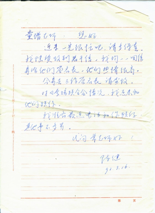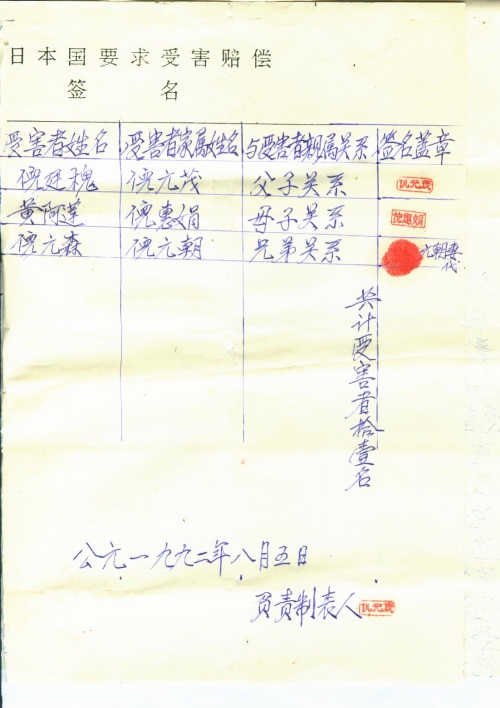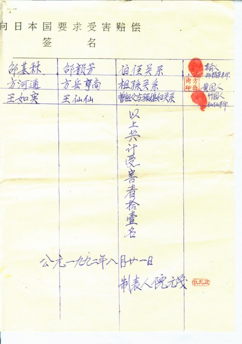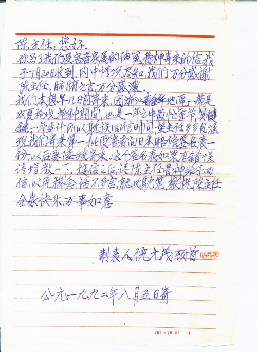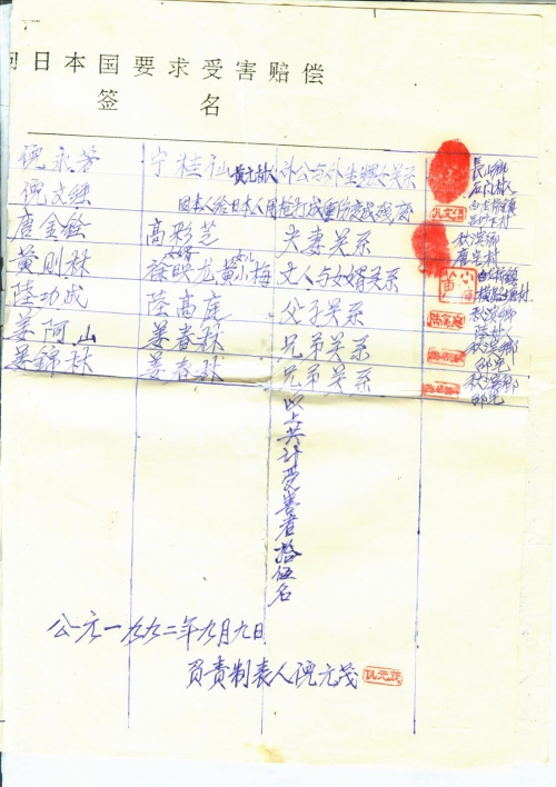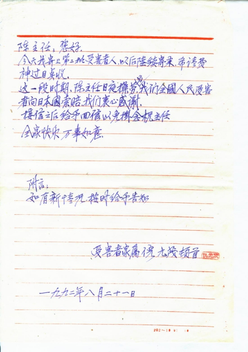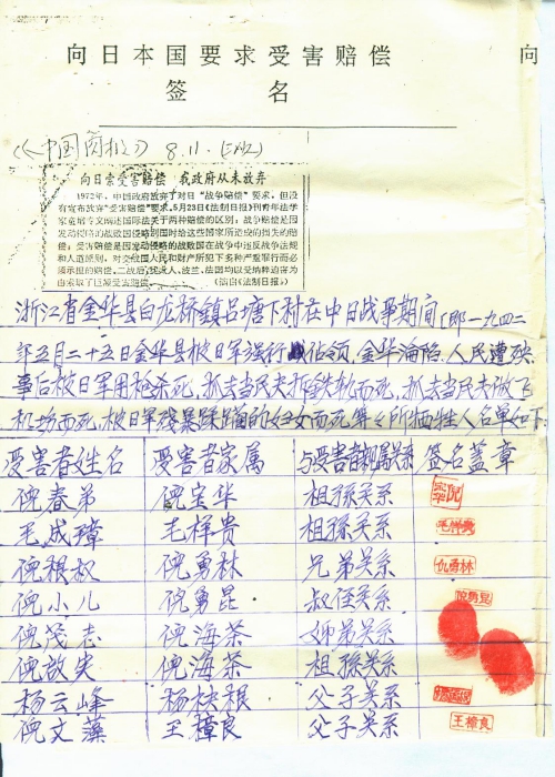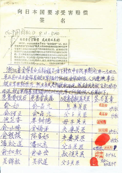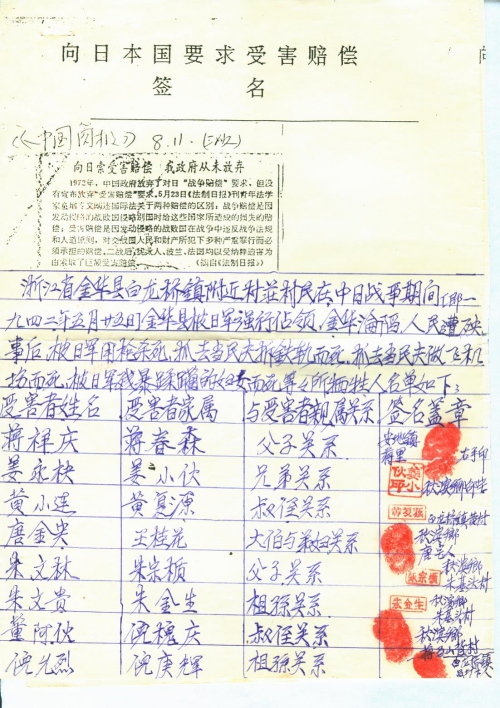 我们本想早几日前寄来,因浙江省金华地区一带是双夏抢收抢种期间,也是一年之中最忙季节,关键一年生机,所以耽误回信时间,望主任多多包涵,现我们寄来第一批受害者向日本赔偿签名表一份,以后要陆续寄来。这个签名表如果有错误请指教一下。接信之后。请陈主任费神给予回信,以免挂念,话不多言,就此耽笔,敬祝陈主任全家快乐,万事如意