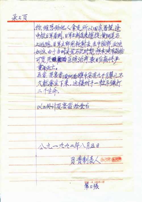 我在中日战争时当中国战士,在一九三九年六月三日晚上一时奉上级命令进攻萧山县长山岛的炮台时被日军用枪打伤右脚,后遣送至后方医院医治[江西省上饶]动手术取出子弹,至今未好,身体衰弱,遗害终身,不会生产,今要求赔偿。