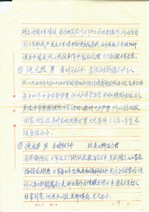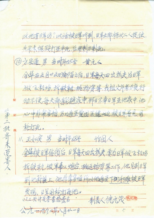 在一九四四年六月二十三日日军利用汉奸强行将我祖父抓去做飞机场,每天工作十分坚苦劳累,但吃食非常坚苦,形如猪狗生活,日久身体非常衰弱又生病,日军见于此人病情十分严重,所以将他放回家,回家之后,当时本地无药可买,又无医师,不久病入膏肓,无法医治而亡。