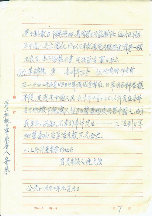 在一九四二年五月卄五日日军强占金华后,日军用各种各样手段,来残杀中国人民,在本年十月十三日以前竟在金华县大地撒下灭绝人性细菌毒物来杀害中国人,由于我弟年小无知。不幸的事件发生——正碰到日军细菌毒物,后医治无效不久而亡。