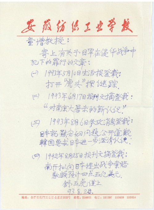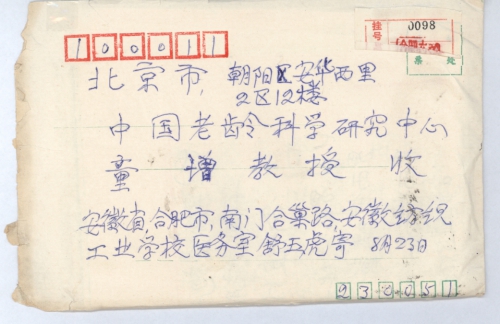 通信处:安徽省合肥市南门合巢路,安徽纺织工业学校医务室舒佳医师转我收,邮编是230051