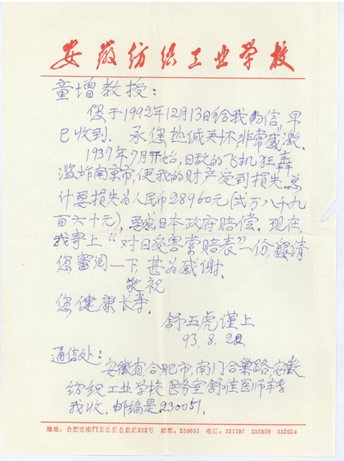 1937年7月开始,日敌的飞机狂轰滥炸南京市,使我的财产受到损失,总计要损失为人民币28960元(贰万八千九百六十元),要求日本政府赔偿。现在,我寄上“对日受害索赔表”一份,恳请您审阅一下,甚为感谢。
