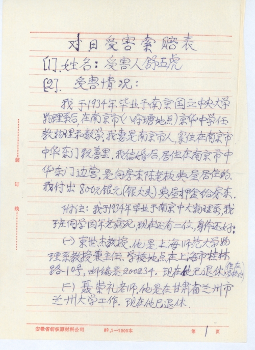 我于1934年毕业于南京国立中央大学物理系后,在南京市(八府塘地点)京华中学任教物理和数学,我妻是南京市人,家住在南京市中华东门积善里,我结婚后,居住在南京市中华东门边营,是向房东陈老板典屋居住的,我付出800元银元(银大头)典屋押金给房东。