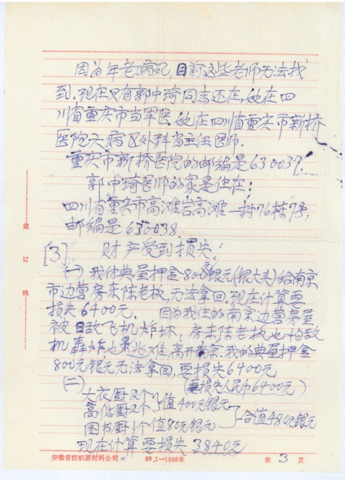1937年7月抗日战争,日本帝国主义派飞机大肆轰炸南京等地;由于敌机狂轰滥炸,很多人被炸死,房屋家具等被炸毁,我家损失也大。1937年11月左右,日敌猛烈进攻,距南京市不多远,由南京市亲友的帮助下,我和我妻带一个不满一岁的小孩逃难到汉口(武汉)。(我的衣服、棉被和皮箱等一件都没有带)。后来又逃难到四川省重庆市,我们住在重庆市米花街。武汉沦陷后,日敌又派飞机轰炸重庆市,重庆市米花街也被轰炸,炸死较多人,房屋、家具等也被炸毁,我家也受到第二次损失,苦不堪言。