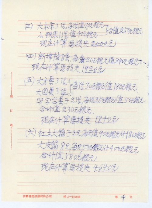 (四)新棉被8条,每条30元银元值240元银元,现在计算要损失1920元。