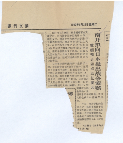 (四)1992年8月25日报刊文摘登载:南开拟向日本提出战争索赔,数额预计四点五亿美元。
