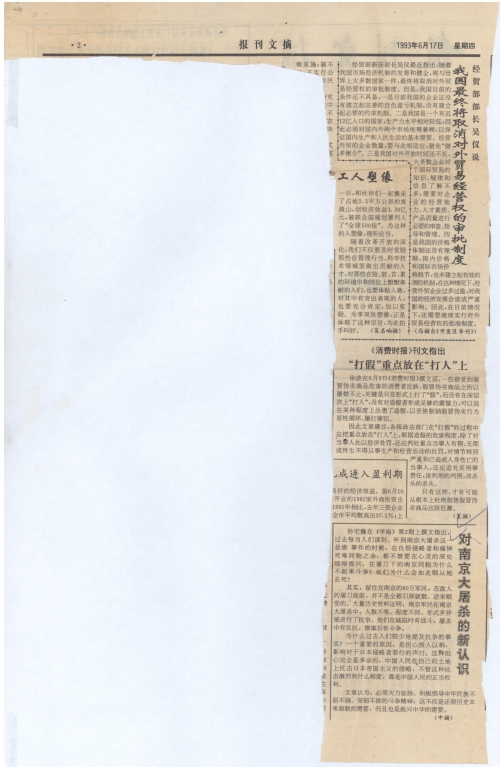 (二)1993年6月17日报刊文摘登载:“对南京大屠杀的新认识。”