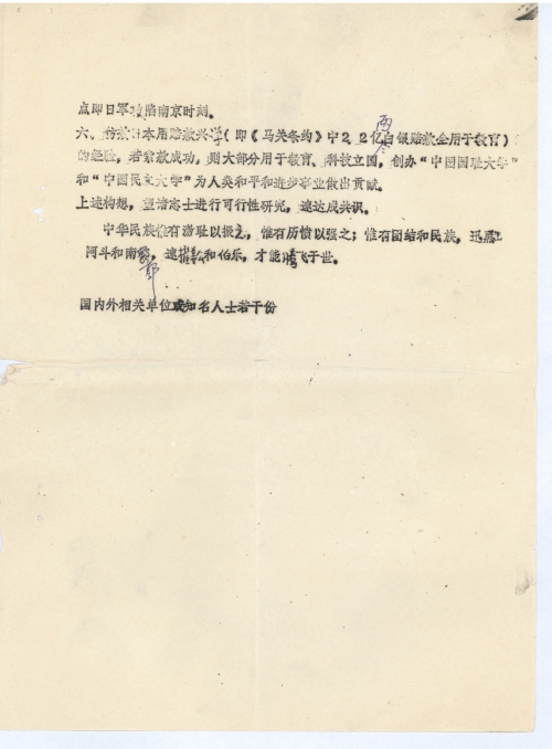 六、仿效日本用赔款兴学(即《马关条约》中2.2亿两白银赔款全用于教育)的经验,若索款成功,则大部分用于教育、科技立国,创办“中国国耻大学”和“中国民主大学”为人类和平和进步事业做出贡献。