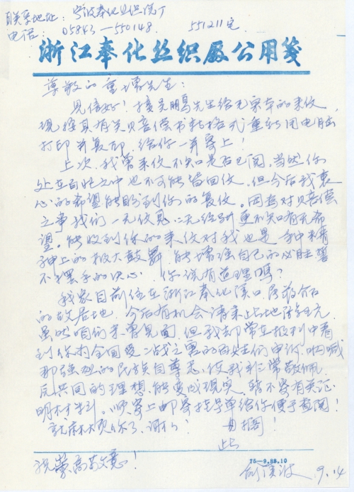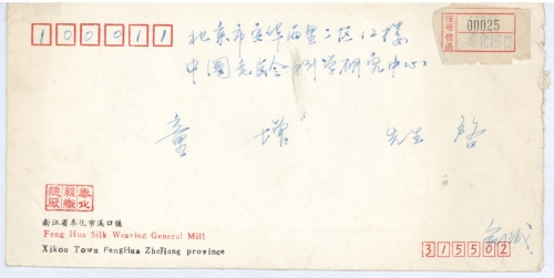 我家目前住在浙江奉化溪口原蒋介石的故居地,今后有机会请来此地游玩,虽然咱们未曾见面,但我却常在报刊中看到你为全国受二战之害的百姓们申诉、呐喊,那强烈的民族自尊感,使我非常敬佩,原共同的理想能转变成现实,暂不寄有关证明材料。顺寄上邮寄挂号单给你便于查阅!