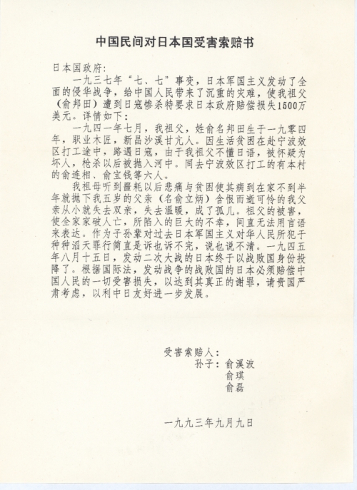 我祖母听到噩耗以后悲痛与贫困使其病[倒]在家不到半年就抛下我五岁的父亲(名俞立炳)含恨而逝,可怜的我父亲从小就失去双亲,失去温暖,成了孤儿。祖父的被害,使全家家破人亡,所陷入的巨大的不幸,[简]直无法用言语来表达。作为子孙辈对过去日本军国主义对华人民所犯于种种滔天罪行简直是诉也诉不完,说也说不清。一九四五年八月十五日,发动二次大战的日本终于以战败国身份投降了。根据国际法,发动战争的战败国的日本必须赔偿中国人民的一切受害损失,以达到其真正的谢罪,请贵国严肃考虑,以利中日友好进一步发展。
