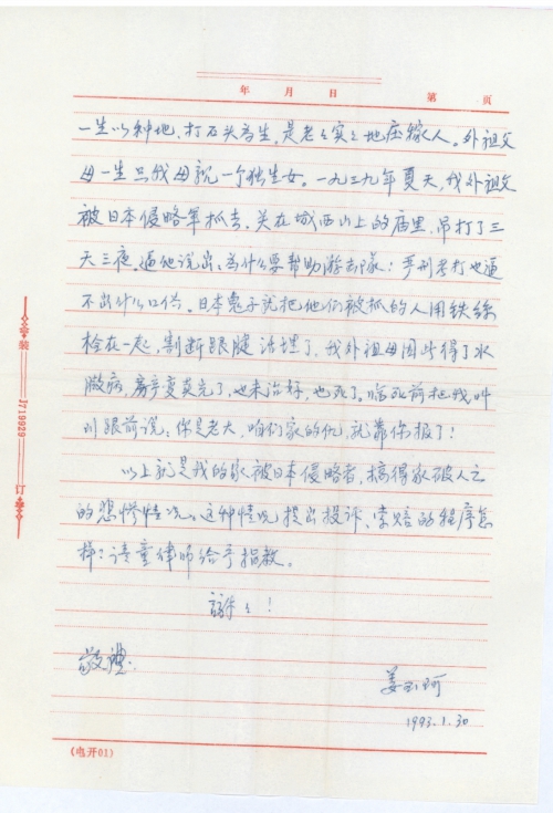 我家祖籍山东省海阳县,祖父母年青时逃荒到烟台市,祖父当了码头工人。我父亲在打渔船上做事,挣钱养活全家,我还可以勉强上学。日本侵占烟台后,征用了我父亲所在的渔船(我当时年纪小不记得船名)。我父亲(姜献亭),因不甘心当亡国奴,不替日本人干事就失业了。从此我们全家便失去了唯一的生活来源,我不但失学,而且讨饭,祖父母年老多病,无钱医治,靠变卖家什,买混合面吃,全家人都浮肿生病。家产卖光了,爷爷病死了,母亲带着弟弟改嫁,妹妹也卖给了人家,至今未找到。我和祖母逃回老家(解放区)才得以幸存下来。我父去上海谋生,至今无音讯。我外祖父(钟宝亭)是福山县城西钟家庄。他一生以种地、打石头为生,是老老实实地庄稼人。外祖父母一生只我母亲一个独生女。一九三九年夏天,我外祖父被日本侵略军抓去,关在城西山上的庙里,吊打了三天三夜,逼他说出:为什么要帮助游击队,严刑考(“考”编辑为“拷”)打也逼不出什么口供。日本鬼子就把他们被抓的人用铁丝栓在一起,割断跟腱活埋了,我外祖母因此得了水脚病,房产变卖光了,也未治好,也死了。临死前把我叫到跟前说:你是老大,咱们家的仇就靠你报了!