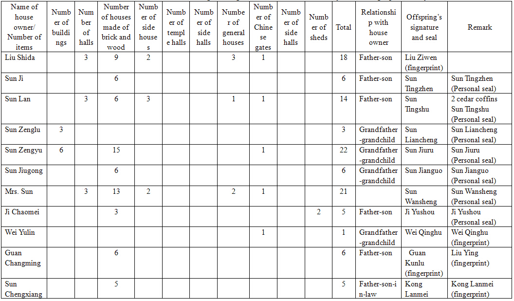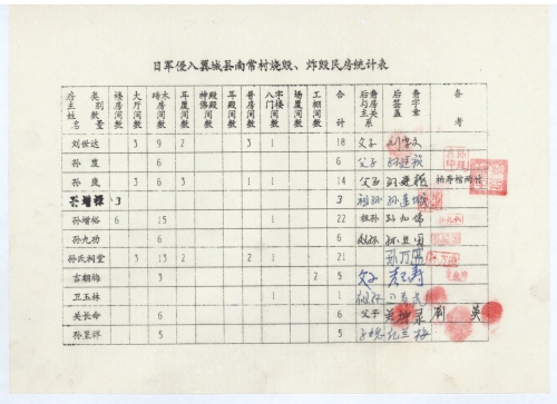 Facts and grounds: On February 18, 1938, the Japanese No. 20 Army invaded Nanchang Village for the first time and suffered some losses due to the resistance of the Chinese No. 499 Division No. 83 Army to the west of the village. Therefore, the Japanese army implemented the inhuman Three Alls policy after entering the village. They burned down villager Liu Shida, Sun Ji and Sun Lan’s three Chinese quadrangles with a total of 38 houses and Sun Ji’s parents’ two cedar coffins. Besides, the Japanese army killed Liu Shida’s father Liu Dianju and Sun Tingshu (personal seal)’s grandfather Sun Bingying and uncle Sun Wei.