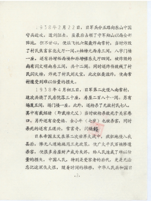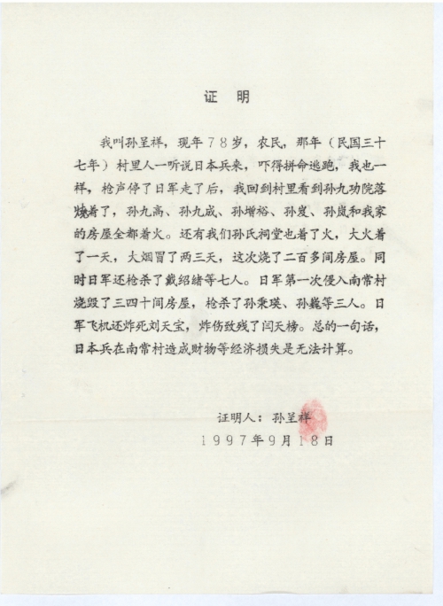 I am Sun Chengxiang, 78, a farmer. In that year (37th year of the National Republic of China), someone said that the Japanese were coming, so many other villagers were so scared and ran away. So was I. When the gunshots stopped and the Japanese army left, I returned to the village and saw that Sun Jiugong’s quadrangle was burned and the quadrangles of Sun Jiugao, Sun Jiucheng, Sun Zengyu, Sun Ji, Sun Lan and my quadrangle too. Our Sun’s Template was also set to fire. While the fire lasted one day, the smoke continued for 2 or 3 days. Over 200 houses were burned down. Besides, the Japanese army shot and killed 7 people including Dai Shaoxu. When the Japanese army invaded Nanchang Village for the first time, they burned down 30 or 40 houses and shot and killed 3 people including Sun Bingying and Sun Wei. The Japanese planes bombed Liu Tianbao to death and disabled Yan Tianbang. In a word, the Japanese army caused immeasurable economic losses to Nanchang Village.