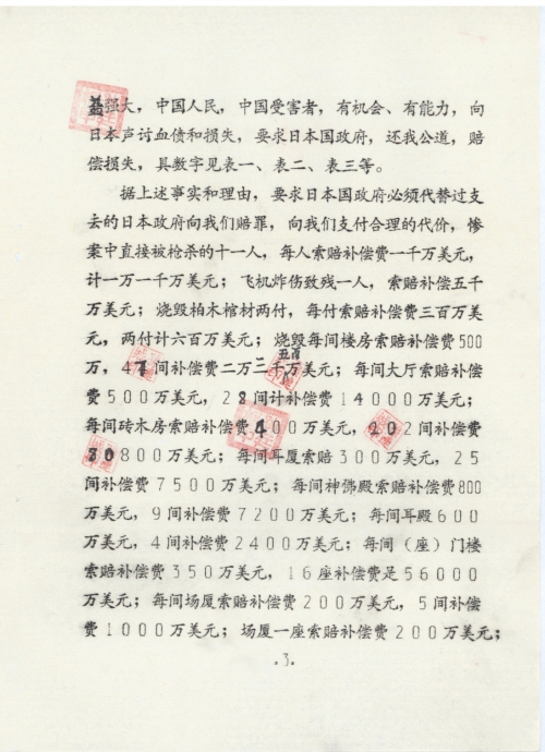 Based on the above facts and reasons, the plaintiffs demand the current Japanese government representing the past Japanese government to apologize and make a proper compensation to us. In the massacre, 11 people were directly shot and killed; we demand a compensation of 10 million USD for each of them, a total of 110 million USD. One person was injured and disabled by the bombing; we demand a compensation of 50 million USD for him. Two cedar coffins were burned; we demand a compensation of 3 million USD for each of them. We demand a compensation of 5 million USD for each of 235 buildings burned down. We demand a compensation of 5 million USD for each of 47 halls burned down for a total of 235 million USD. We demand a compensation of 5 million USD for each of 28 halls burned down for a total of 140 million USD. We demand a compensation of 4 million USD for each of 202 houses made of brick and wood burned down for a total of 808 million USD. We demand a compensation of 3 million USD for each of 25 side houses burned down for a total of 75 million USD. We demand a compensation of 8 million USD for each of 25 temple halls burned down for a total of 72 million USD. We demand a compensation of 6 million USD for each of 4 side temple halls burned down for a total of 24 million USD. We demand a compensation of 3.5 million USD for each of 16 Chinese gates burned down. We demand a compensation of 2 million USD for each of 5 side halls burned down. We demand a compensation of 2 million USD for each of 2 sheds burned down. The total compensation amount is 2.119 billion USD.
