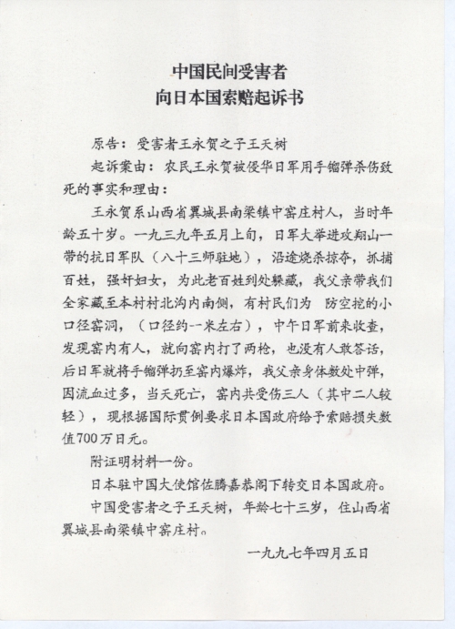 王永贺系山西省翼城县南梁镇中窑庄村人,当时年龄五十岁。一九三九年五月上旬,日军大举进攻翔山一带的抗日军队(八十三师驻地),沿途烧杀掠夺,抓捕百姓,强奸妇女,为此老百姓到处躲藏,我父亲带我们全家藏至本村村北沟内南侧,有村民们为防空挖的小口径窑洞,(口径约一米左右),中午日军前来[搜]查,发现窑内有人,就向窑内打了两枪,也没有人敢答话,后日军就将手镏弹扔至窑内爆炸,我父亲身体数处中弹,因流血过多,当天死亡,窑内共受伤三人(其中二人较轻),现根据国际贯例要求日本国政府给予索赔损失数值700万日元。