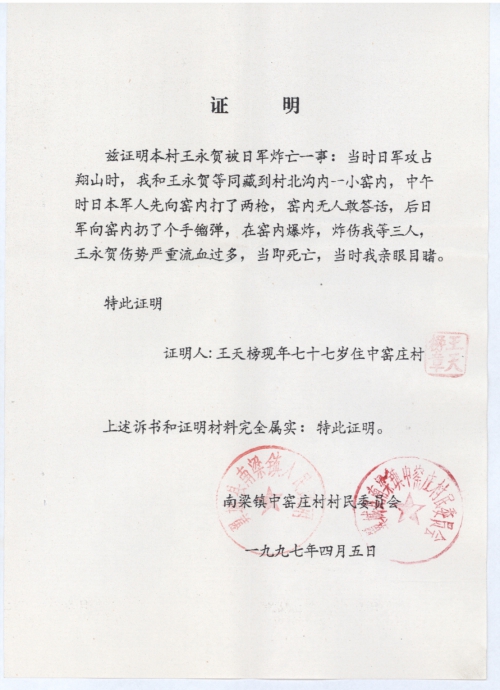 兹证明本村王永贺被日军炸亡一事:当时日军攻占翔山时,我和王永贺等同藏到村北沟内一小窑内,中午时日本军人先向窑内打了两枪,窑内无人敢答话,后日军向窑内扔了个手镏弹,在窑内爆炸,炸伤我等三人,王永贺伤势严重流血过多,当即死亡,当时我亲眼目睹。