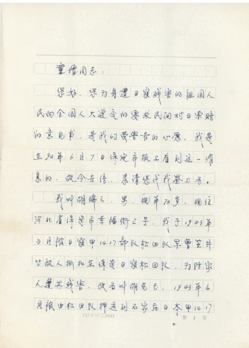 You have made our long-held desire come true by submitting a proposal claiming civilian compensation from Japan to the People’s Congress for those Chinese people who suffered from the crimes of the Japanese army. I read the article about your efforts in the Baoding Newspaper on June 7, 1992, so I am writing to you and ask you to sign my name to the petition.