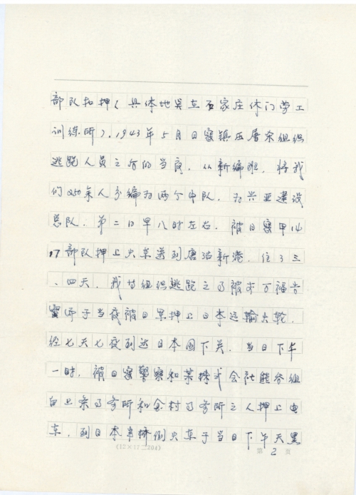 I was sent to the Japanese A 1417 Troop of Shijiazhuang (located at Labor Training House, Xiumen, Shijiazhuang) in April 1943. In May 1943, in the evening of the day after the Japanese soldiers suppressed and massacred escapees, they reorganized 250 people, including me, into two teams and named us the Koa Construction Corps. At about 8 a.m. of the next day, we were escorted to Tanggu New Port by the Japanese A 1417 Troop and stayed there for three or four days.