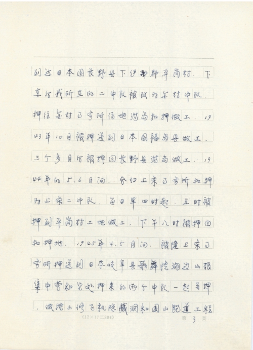 Other details:In 1943, I was taken by the Japanese soldiers from Baoding to the labor training camp in Shijiazhuang, and then to Tanggu, reaching Japan after seven days. I was escorted to Fukushima to do hard labor. In Japan, I was treated brutally, and was constantly hungry and cold. Beating and scolding were common. My mind and body were devastated. Compensations should be offered for redressing my suffering.