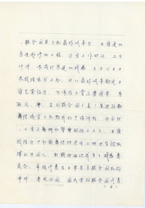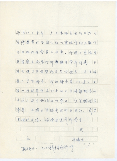 To facilitate supervision and rule, the Japanese army numbered us on our body. My number was 173. To escape responsibility, the Japanese army changed the Chinese prisoner list to the Chinese laborer list in July of 1945. The Japanese army must pay this debt. It’s reasonable and just to demand compensation against Japan. I firmly support you and ask you to sign the petition letter on behalf of me.