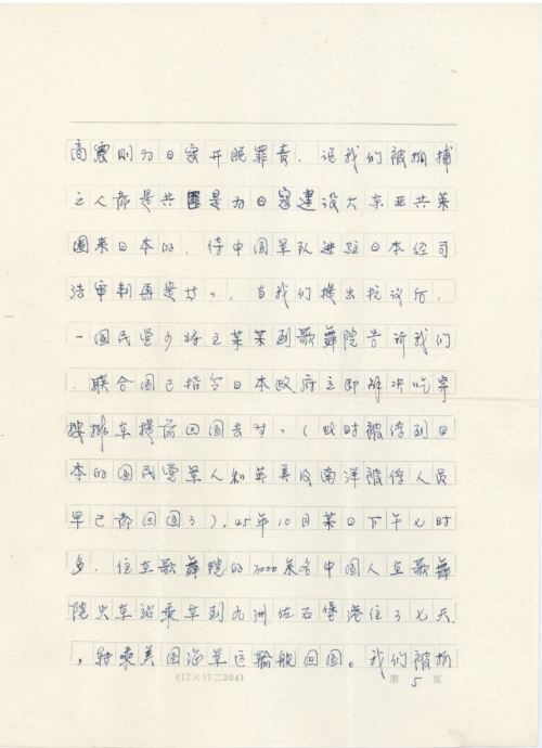 After Japan’s surrender, we knew that there were other Chinese people laboring on construction sites near the Dance Academy. A war prisoner committee was organized and representatives were sent to make a petition to the UN agency in Tokyo, Japan and demand our return to homeland. Shang Zhen, the representative of the Chinese Nationalist Party at the UN agency helped the Japanese by saying that we were Communist Party members that came to Japan for construction of the Greater East Asia Co-Prosperity Sphere and that he would decide how to handle us through a judicial trial after the Chinese army came to Japan.