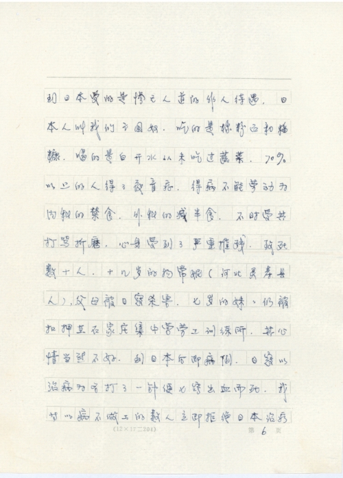 The teenager Yang Changni (Lingshou, Heibei)’s parents were killed by the Japanese army and her seven-year-old sister was held at the Labor Training House of Shijiazhuang, so the yonger sister suffered mentally and got sick soon after she arrived in Japan. The Japanese army gave her an injection in the name of curing her disease, but she bled from her seven orifices and she died immediately. After that, when we were sick, many of us refused treatment by the Japanese in order not to suffer the same fate.