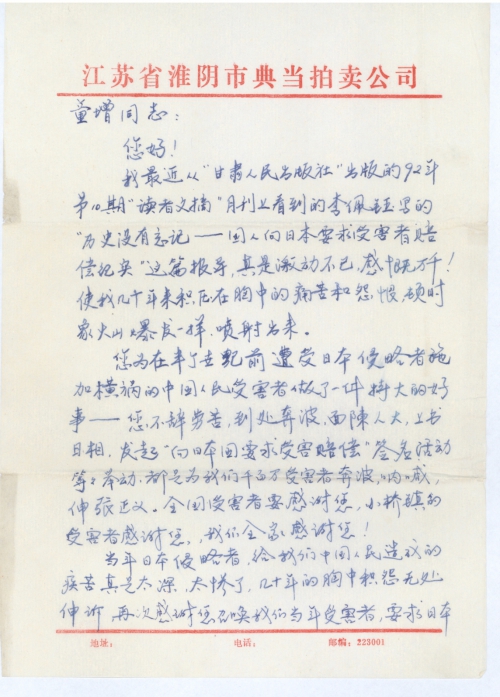 您在为半个世纪前遭受日本侵略者施加横祸的中国人民受害者做了一件特大的好事——您不辞劳苦,到处奔波,面陈人大,上书日相,发起“向日本国要求受害赔偿”签名活动等等举动,都是为我们千百万受害者奔波、呐喊、伸张正义。全国受害者要感谢您,小桥镇的受害者感谢您,我们全家感谢您!