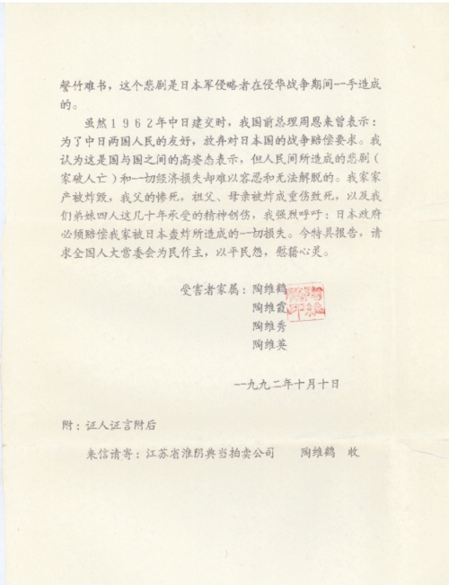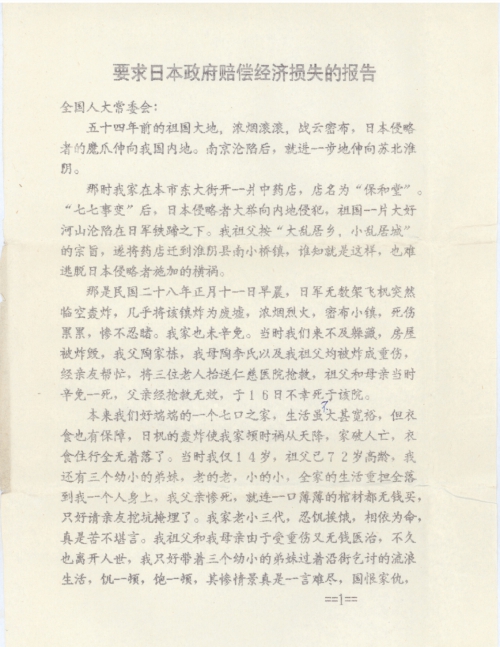 虽然1962年中日建交时,我国前总理周恩来曾表示:为了中日两国人民的友好,放弃对日本国的战争赔偿要求。我认为这是国与国之间的高姿态表示,但人民间所造成的悲剧(家破人亡)和一切经济损失却难以容忍和无法解脱的。我家家产被炸毁,我父的惨死,祖父、母亲被炸成重伤致死,以及我们弟妹四人这几十年承受的精神创伤,我强烈呼吁:日本政府必须赔偿我家被日本轰炸所造成的一切损失。今特具报告,请求全国人大常委会为民做主,以平民怨,慰藉心灵。