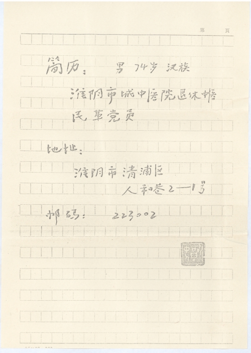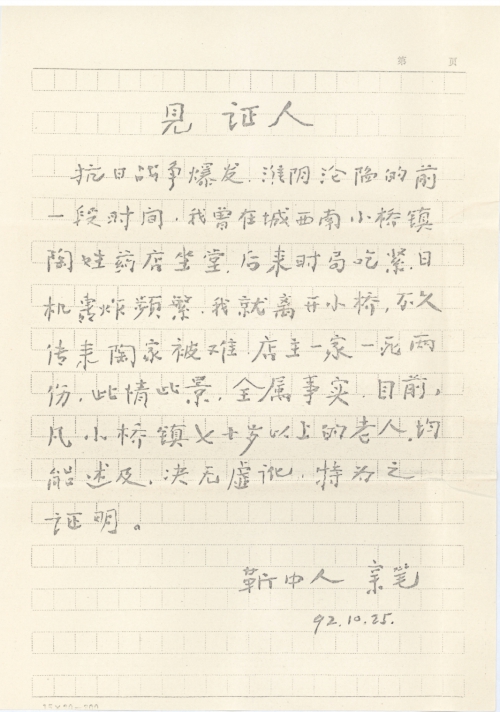 抗日战争爆发,淮阴沦陷的前一段时间,我曾在城西南小桥镇陶姓药店坐堂,后来时局吃紧,日机轰炸频繁,我就离开小桥,不久传来陶家被难,店主一家一死两伤,此情此景,全属事实。目前,凡小桥镇七十岁以上的老人,均能述及,绝无虚讹,特为之证明。