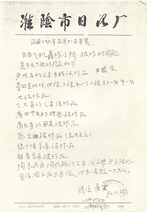那是民国二十八年正月十一日早晨,日军无数架飞机突然临空轰炸,几乎将该镇炸为废墟,浓烟烈火,密布小镇,死伤累累,惨不忍睹。我家也未幸免。当时我们来不及躲藏,房屋被炸毁,我父陶家栋,我母陶李氏以及我祖父均被炸成重伤,经亲友帮忙,将三位老人抬送仁慈医院抢救,祖父和母亲当时幸免一死,父亲经抢救无效,于16日不幸死于该院。