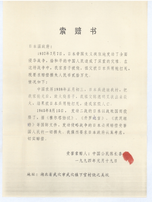 细节:1938年日本兵侵略我村,把我家抢光后放火烧房子我的祖父出来救火被日本兵打死。我要求日本政府赔偿我家的所有损失。
