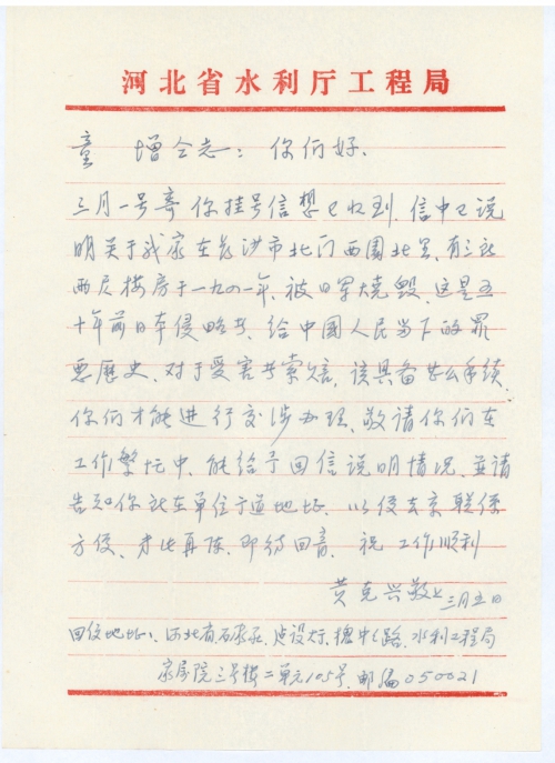 三月一号寄你挂号信想已收到,信中已说明关于我家在长沙市北门西园北里,有三所两层楼房于一九四一年,被日军烧毁,这是五十年前日本侵略者,给中国人民留下的罪恶历史,对于受害者索赔,该具备什么手续你们才能进行交涉办理,敬请你们在工作繁忙中,能给与回信说明情况,并请告知你所在单位街道地址,以便去京联系方便,专此再陈,即待回音。