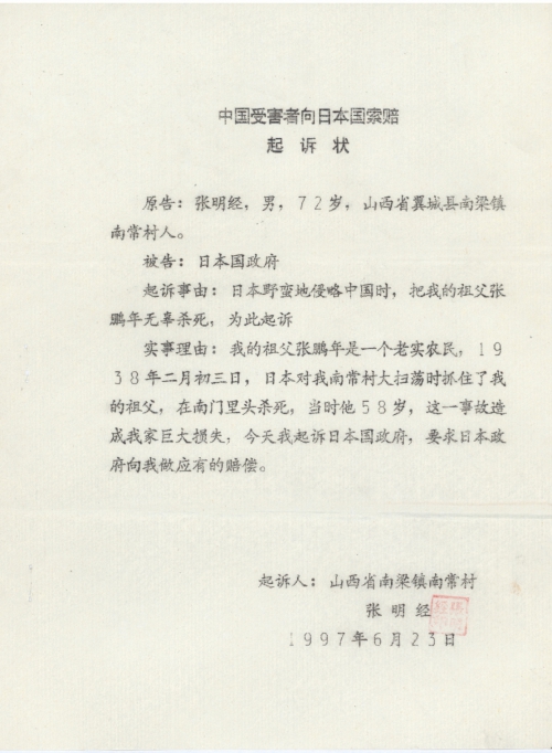 起诉事由:日本野蛮地侵略中国时,把我的祖父张鹏年无辜杀死,为此起诉