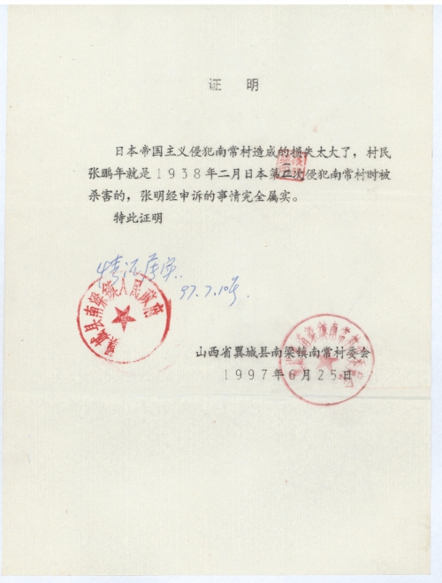 日本帝国主义侵犯南常村造成的损失太大了,村民张鹏年就是1938年二月日本第三次侵犯南常村时被杀害的,张明经申诉的事情完全属实。