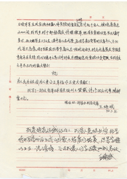 7月19日我从江苏邳县自费到浙江义乌市江湾乡崇山村,这是1942年日侵华军在此实施细菌人体实验的重灾区,三村总计死千余人,被烧房屋近2000间,我找乡、村干部协商后,情绪激昂,把有关索赔信息当天又复印多份,两天内签名534名(其中有几名代签,原因是真正受害的文盲老人,不让代签不愿意。由于当前农忙季节,商议过一段时间,由乡、村民代表签名,写报告市府、要求支持,我25日离开义务回到邳县,为完成索赔任务,在我有生之年,尽到我的最大努力!