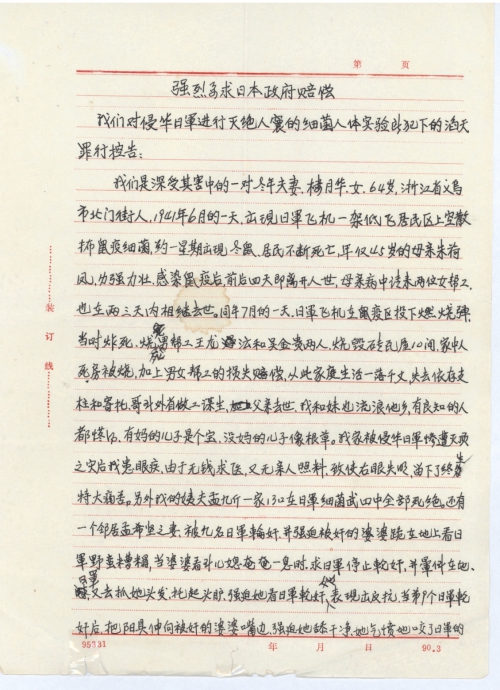 我们是深受其害中的一对老年夫妻,楼月华,女,64岁,浙江省义乌市北门街人。1941年6月的一天,出现日军飞机一架低飞居民区上空散[布]鼠疫细菌,约一星期出现老鼠、居民不断死亡,年仅45岁的母亲朱荷凤,身强力壮,感染鼠疫后,前后四天即离开人世。母亲病中请来两位女帮工,也在两三天内相继去世。同年7月的一天,日军飞机在鼠疫区投下燃烧弹,当时炸死、烧死男帮工王龙沄和吴金贵两人,烧毁砖瓦屋10间,家中人死房被烧,加上男女帮工的损失赔偿,从此家庭生活一落千丈,失去生存支柱和寄托。哥到外省做工谋生,父亲去世,我和妹也流浪他乡,有良知的人都懂得,有妈的儿子是个宝,没妈的儿子像根草。我家被侵华日军惨遭灭顶之灾后,我患眼疾,由于无钱求医,又无亲人照料,致使右眼失明,留下了终生特大痛苦。另外我的姨夫孟九斤一家13口在日军细菌武器中全部死绝。还有一个邻居孟某某之妻,被九名日军轮奸,并强迫被奸婆婆跪在地上看日军野蛮糟蹋,当婆婆看到儿媳奄奄一息时,求日军停止轮奸,并晕倒在地,日军又去抓她头发,托起头颅,强迫她看日军轮奸,她表现出反抗。当第9个日军轮奸后,把阳具伸向被奸的婆婆嘴边,强迫她舔干净,她气愤地咬了日军的阳具,日军用刺刀一下捅进她的胸膛,婆婆死了,儿媳也死了。