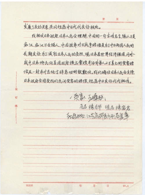 我相信日本政府、日本人民会理解。中国的一句古传名言,饶人不是痴汉,痴汉不会饶人,中国放弃对日战争赔偿是为了中日两国人民的长期友好,为了减轻日本人民的负担,现日本居世界经济强国,同时二战中,日本侨民向美国政府提出索赔,并获得每人2万美元的受害赔偿及一封布什总统言辞恳切的致歉信。我们确信日本人民会支持,日本政府会接受我们民间受害的赔偿。祝愿中日友好代代相传。