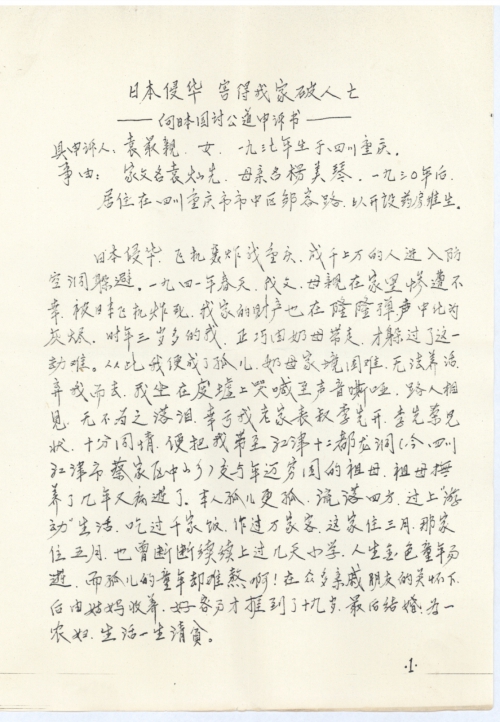 细节:1941年日本飞机轰炸重庆,成千上万的人进入防空洞躲避。我的父亲,母亲在家里惨遭不幸被日本飞机炸死,我家的财产也被化为灰烬,从此我成了孤儿。现在特此要求日本赔偿我的所有损失。另寄上证明材料。