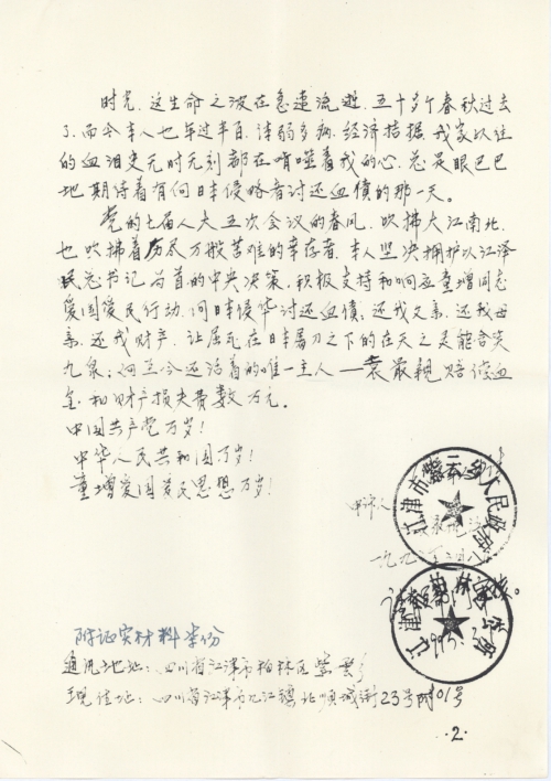 党的七届人大五次会议的春风,吹拂大江南北,也吹拂着历尽万般苦难的幸存者。本人坚决拥护以江泽民总书记为首的中央决策,积极支持和响应童增同志爱国爱民行动,向日本侵华讨还血债:还我父亲,还我母亲,还我财产,让屈死在日本屠刀之下的在天之灵能含笑九泉;向至今还活着的唯一主人——袁众亲赔偿血金和财产损失费数万元。