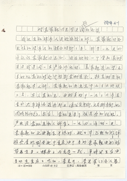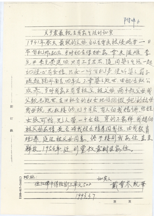 我现在江津市人民检察院工作。袁众亲同志现住江津市几江镇白顺街1号。我是一九五四年认识袁众亲同志的。因为她的一个堂叔袁树臣与我是同一生产合作社的,袁众亲是从紫云乡姐姐袁灿珍处迁移到袁树臣家。据袁树臣和袁众亲本人讲,袁众亲的老业在中山乡大地埧二名,其父袁灿先,母杨美琴于一九三几年去重庆太平洋西药房[帮]工(家住受朱街,又名都市街,现周渝路附近),尔后,袁灿先当了该药房的经理,产权属袁灿先私人所有。一九四一年的一天,袁众亲的父母亲在午休时,被日本飞机的炸弹将房屋炸倒而死于重庆,由于当时袁众亲由奶娘带看在另一栋房子内免遭一死。事情发生后由当时在重庆工作的,李先开,李先荣(三合人李先荣现住沙埂乡82岁)将袁灿先,杨美琴的尸体处理后,把袁众亲带回三合,袁众亲先后在其姐,叔长大成人,与伍华春同志结为夫妇。
